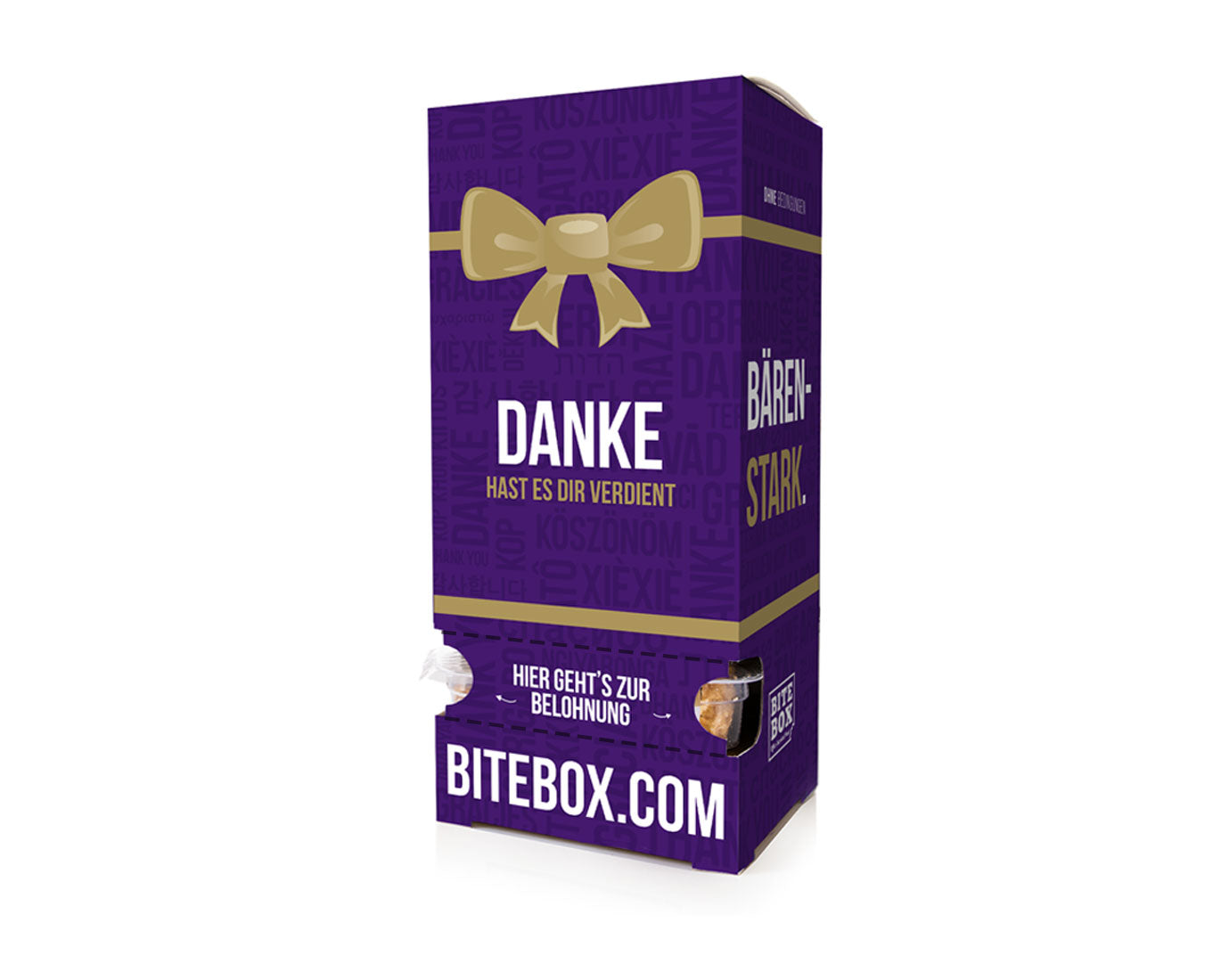 Unsere Big Bite-Box ist der Hingucker am Arbeitsplatz, an der Kasse oder auf dem Tresen. Dieser schöne Aufsteller ist ein echtes Allroundtalent und trifft garantiert zu 100% jeden Geschmack – perfekt für neugierige Naschkatzen und -kater. Die Angestellten freuen sich über einen energiereichen Snack zwischendurch oder in der Kantine und die Kunden über einen kleinen Snack im Auto oder Zuhause.
