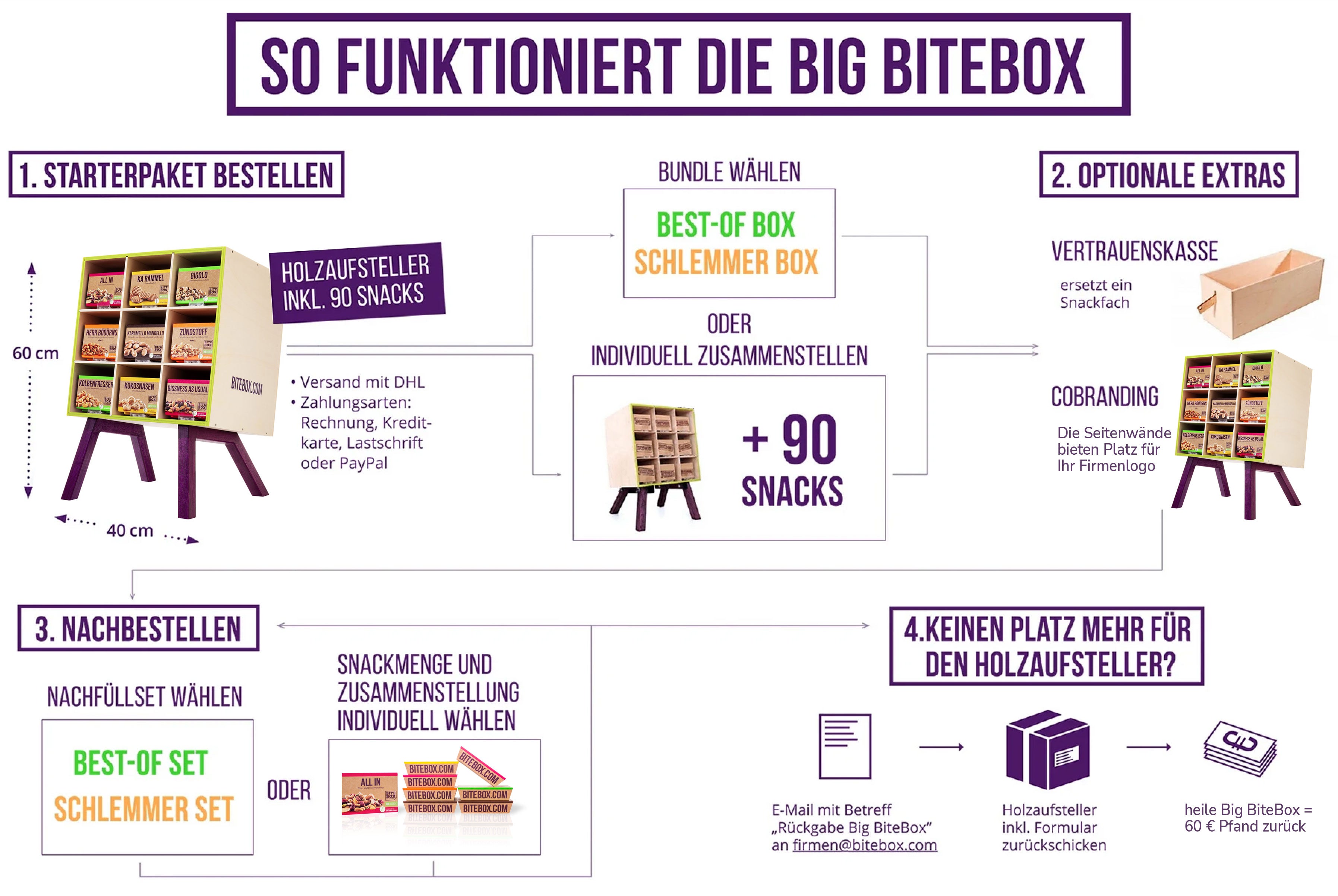 Du darfst dich also auf einen bunt gemischten Mix aus unseren beliebtesten Snacks freuen, die du bei Bedarf immer wieder nachfüllen kannst. Die Maße des Aufstellers beträgt 27cm x 38cm x 23cm (BxHxT). Der Pfand ist anders als bei der Big-Bite-Box hier schon im Preis inklusive, den du nach Rücksendung der Box erstattet bekommst.